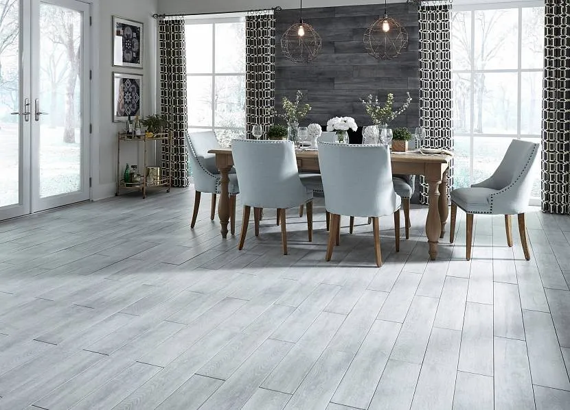 Рисунок, повторяющий фактуру выбеленной древесины или белого мрамора, позволяет применять такое покрытие для большинства помещений. Такой материал имеет меньшую стойкость к внешним воздействиям по сравнению с керамогранитом и плиткой, но и стоит дешевле.
