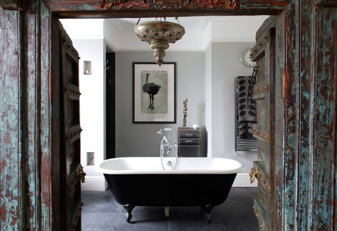 Пол из плит керамогранита под мрамор с нейтральным серым рисунком гармонично вписывается в слегка эксцентричный стиль этой ванной