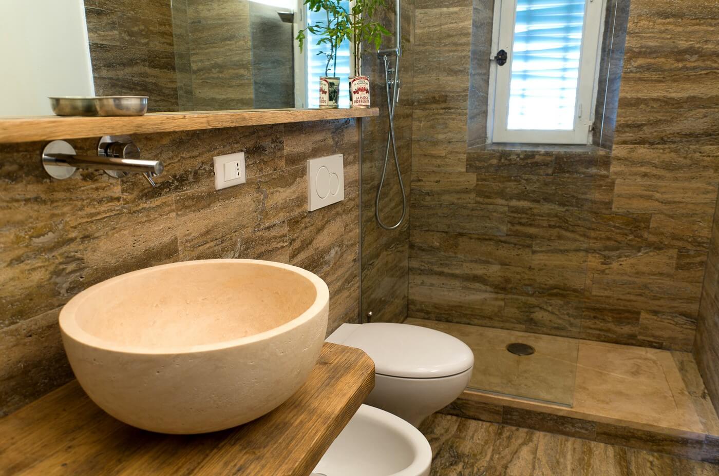 Из травертина вырезают плиты для облицовки стен и пола, делают раковины, поддоны для душа и иногда столешницы
