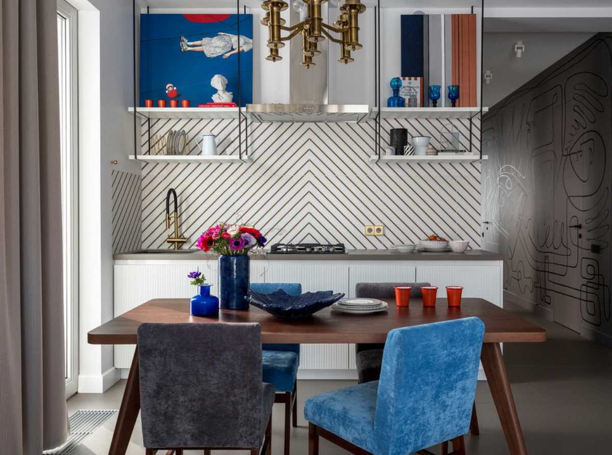 Не оформляйте обеденную зону около синей стены, потому что на ее фоне еда будет выглядеть менее аппетитно. Если уж очень хочется, то пусть это будет бирюзовый, либо голубой оттенок. Обязательно разбавляйте синий оранжевым и желтыми цветами, возбуждающими аппетит.