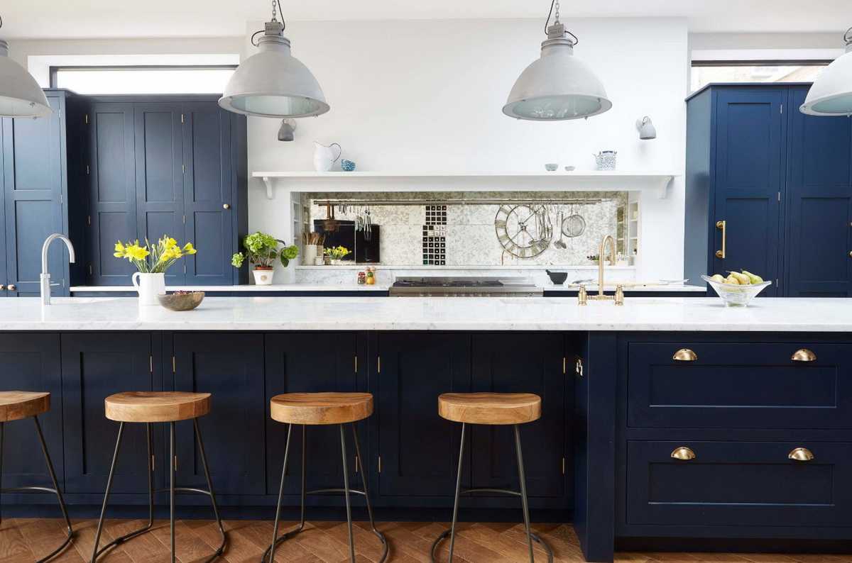 Обилие натурального дерева в кухне синего цвета сделает ее уютне и теплее. Древесные оттенки всегда идеально комбинируются с синими в любом стиле. Дерево делает синий более благородным. Как минимум, столешница и пол должны быть деревянными.