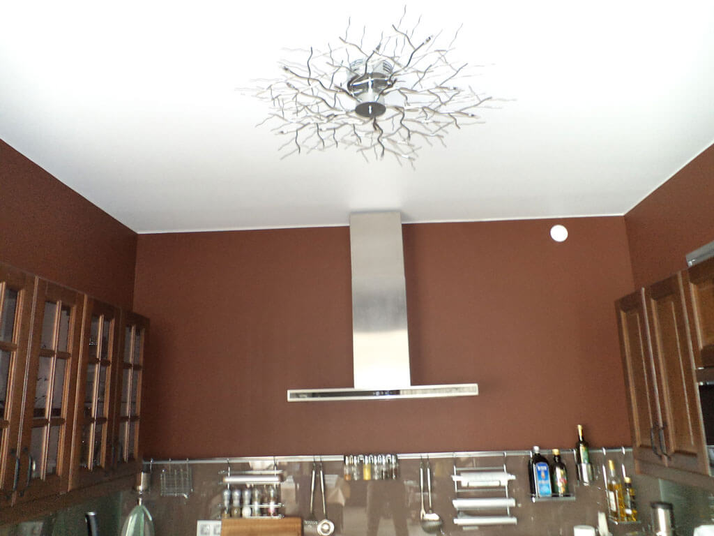 Натяжные потолки на кухне — не просто хорошее решение, а одно из лучших во время ремонта. По стоимости это выйдет примерно как гипсокартонные потолки, только делаются намного быстрее, проще, а пыль практически отсутствует.