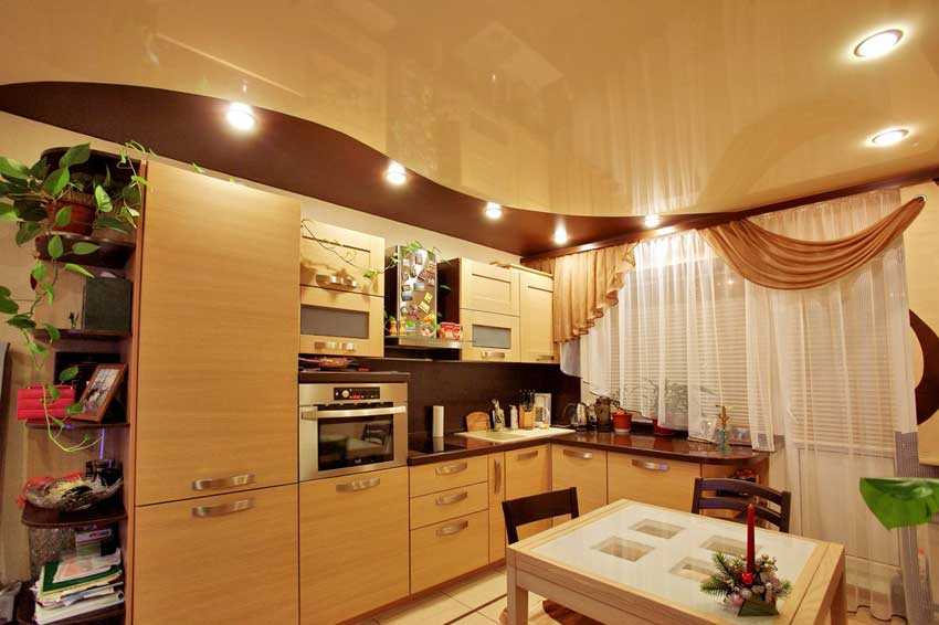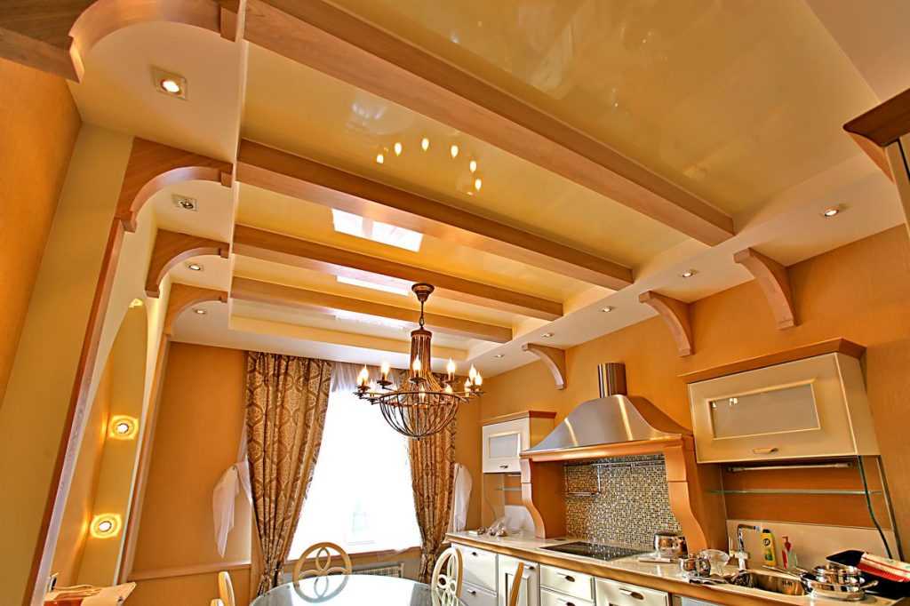 Как видно, натяжной потолок из пленки — практически идеальный вариант для кухни.