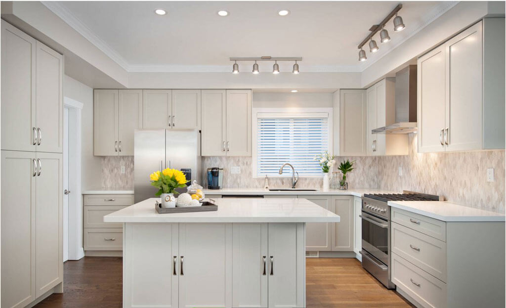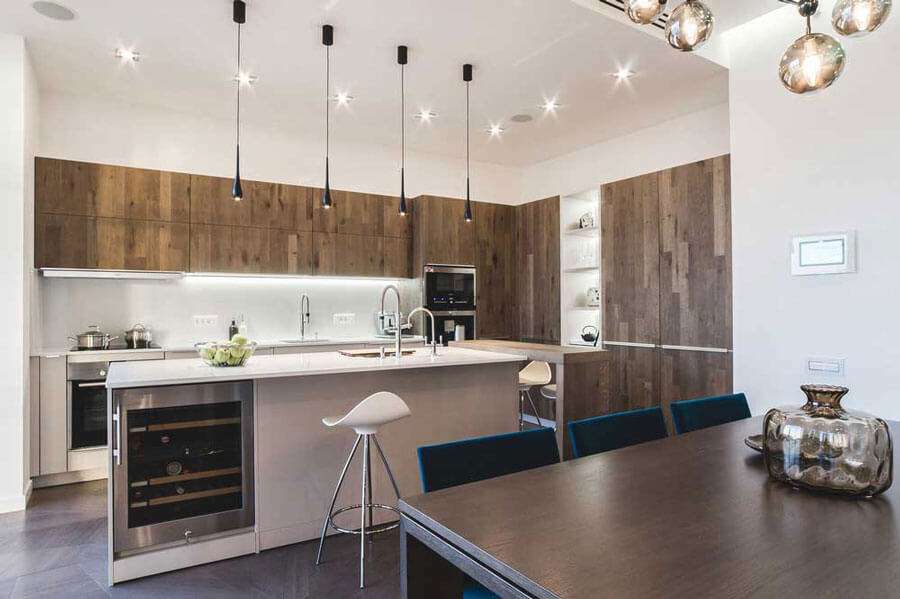 - невозможность изменить свет. Отверстия для установки светильников делаются сразу, а после их перенести нельзя. Но на кухне сложно сделать перепланировку, поэтому перенос и не требуется. Главное — сделать точечные источники света и над рабочей, и над обеденной зоной;