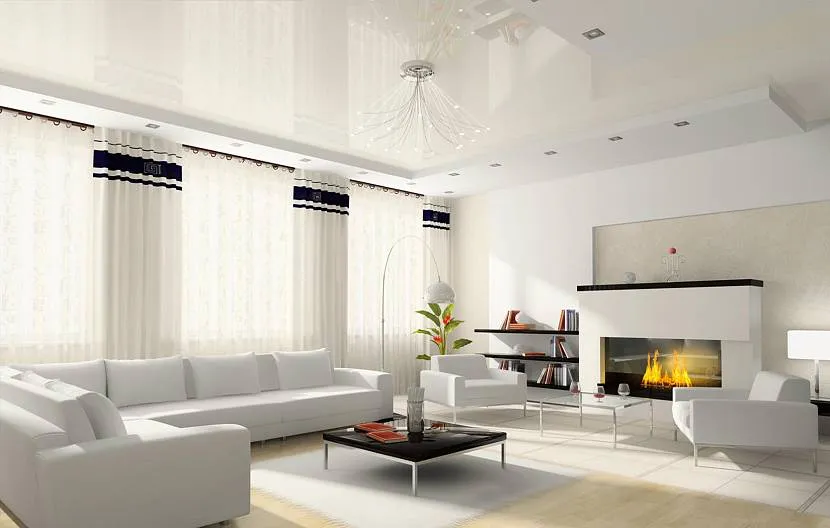 - белому. Такой глянцевый потолок добавляет простора и чистоты в помещении. Оптимальный вариант для небольших комнат и выходящих окнами на северную сторону. Позволяет правильно расставить акценты;
