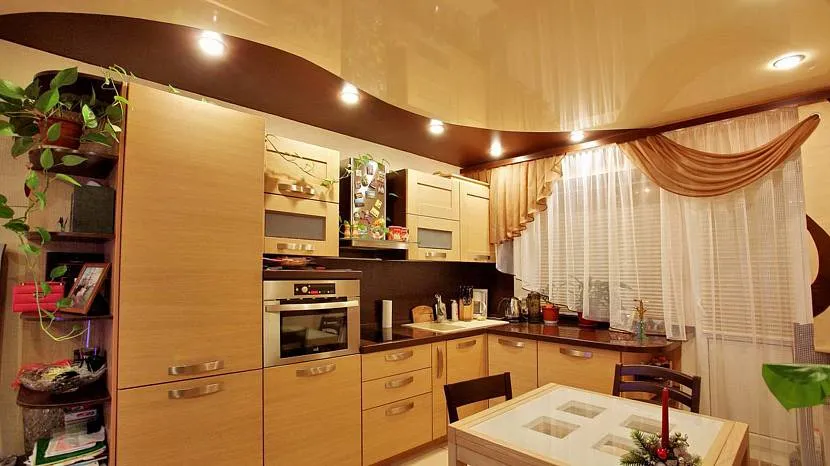 Глянцевый потолок из дешевых материалов никогда не будет добавлять кухне эстетики. Благородный матовый (даже из материалов бюджетной категории) всегда лучше дешевого глянца.