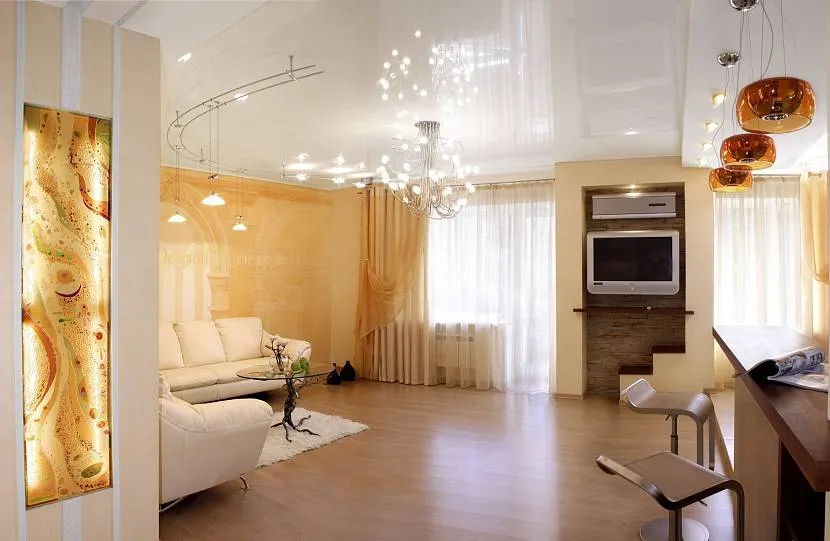 Способность глянца к зеркальному отражению позволяет получать разнообразные световые эффекты; отраженный свет осветительных приборов и окон увеличивает освещенность. Для конструкции можно выбрать светопрозрачное полотно и установить за ним лампы; результатом будет мягкий, рассеянный свет, что подойдет, например, для спальни.