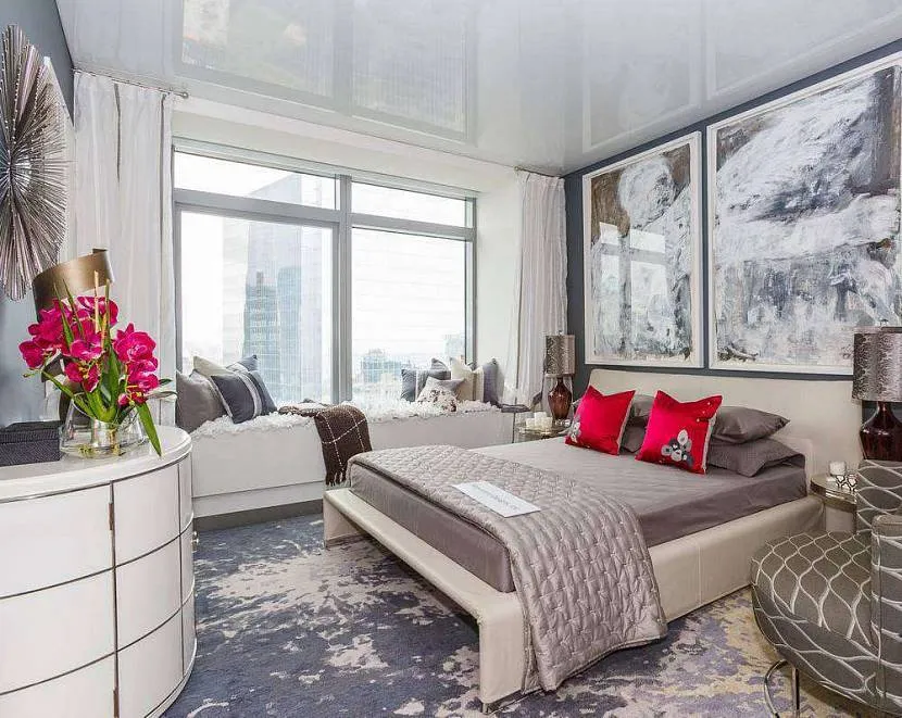 - красному. Для этого глянцевого натяжного потолка требуется простор и площадь. Смотрится уместно в широкой гостиной с огромными окнами;