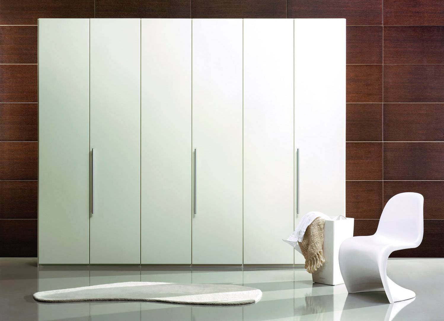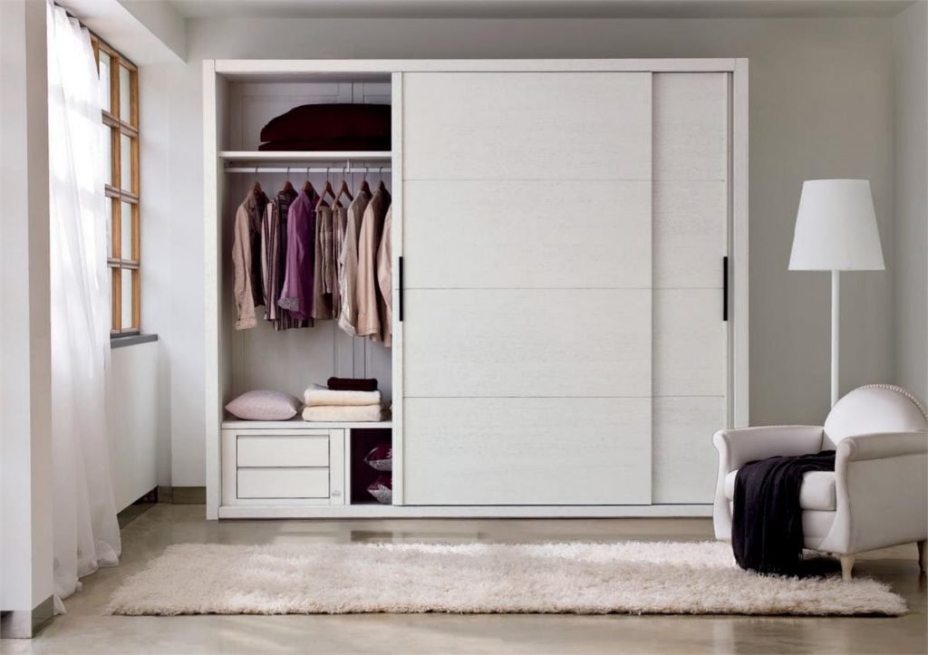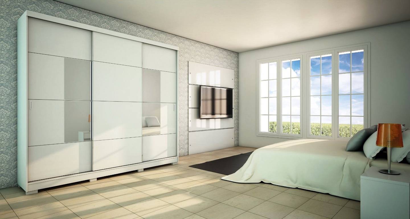 В большую комнату хорошо впишется белый трехстворчатый корпусный шкаф. В маленькую лучше выбрать компактный вариант. Встроенный шкаф — самый удачный выбор для ограниченного пространства. Это мебель без задней стенки, размером от пола до потолка. Такие модели дешевле, компактнее и установить их можно в любой части комнаты.