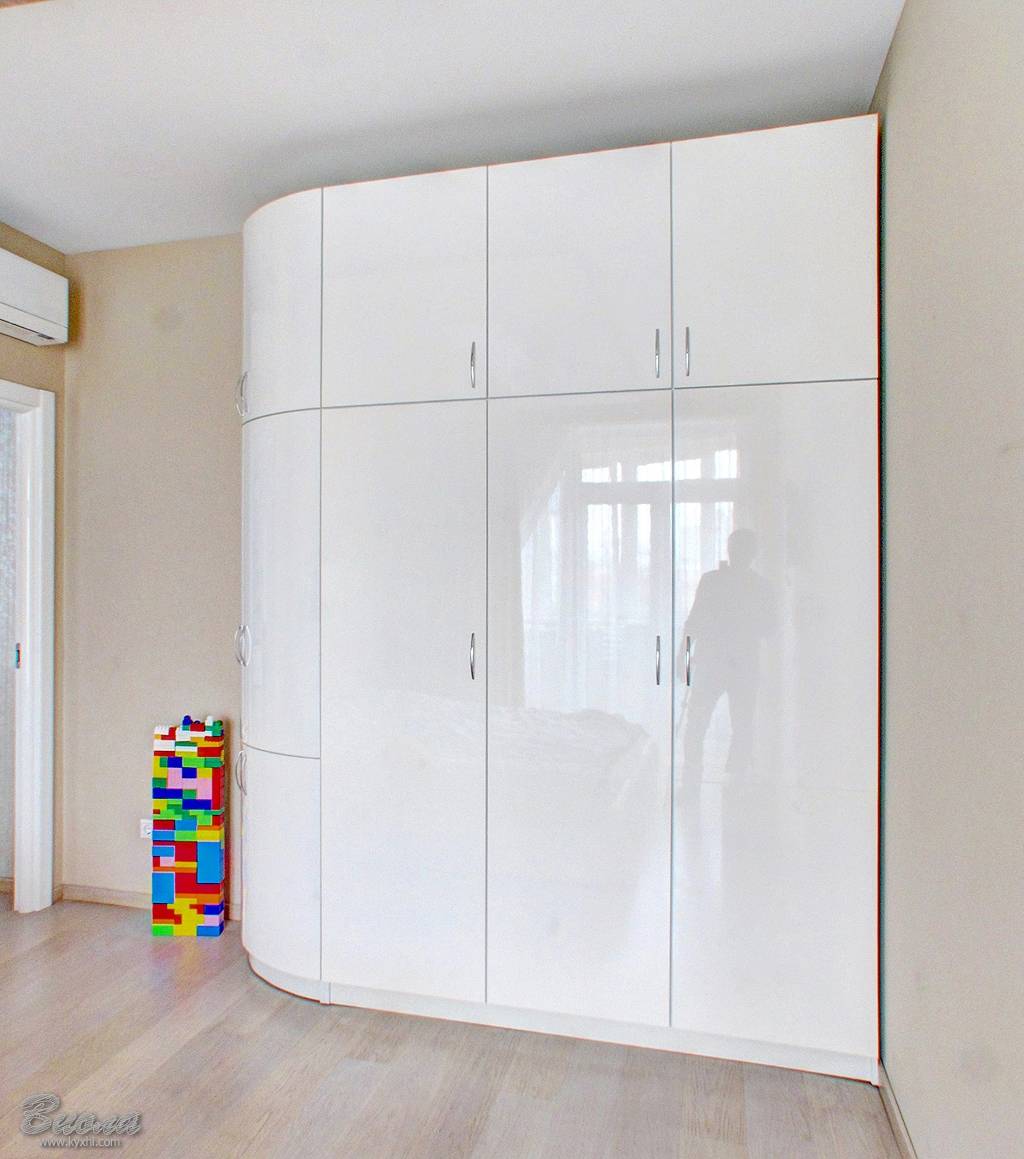 - радиусные – фасады имеет криволинейную необычную форму. Шкаф может выглядеть как полусфера или капля, или представлять собой более сложную волнообразную конструкцию с выпуклыми и вогнутыми створками. Такая конфигурация позволяет разместить шкаф в комнате самых сложных очертаний и найти место для вещей в самом узком пространстве.