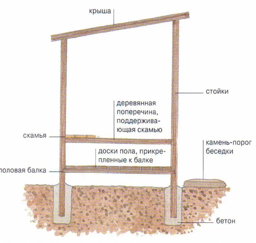 - Вначале идет пол, на который укладывается доска (см. Доска для беседки: выбираем правильно для пола).