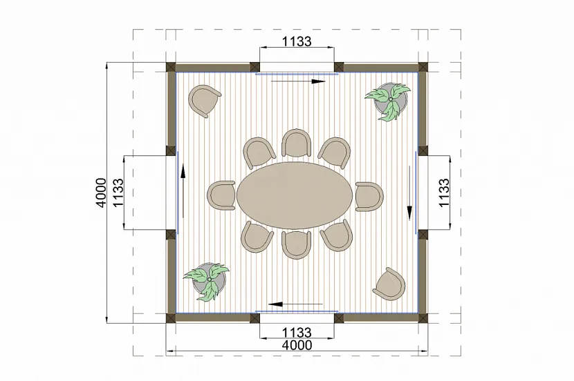 Беседка полузакрытого типа. Предназначена для выполнения функции столовой в теплую погоду. Конструкция защищена с углов от ветра и дождя. В ее проекте предусмотрены широкие проемы со всех 4 сторон
