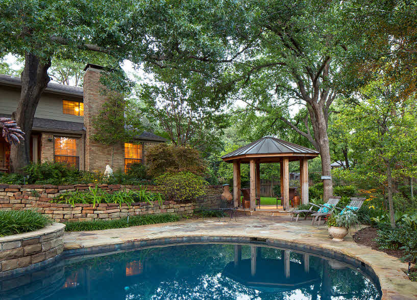 Деревянная беседка с металлической рамой. В этом оазисе спокойствия хорошо мечтается под шелест листвы и шум плоского водопада.Источник pinterest.ru