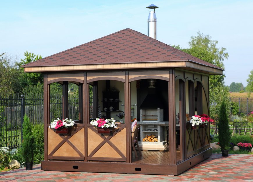 Чтобы пользоваться мангалом или печкой даже зимой, делай закрытую или полузакрытую беседку. Выбирай пожаробезопасные материалы, которые меньше коптятся – например, камень или кирпич.