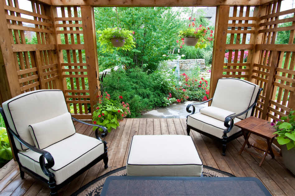 - Мебель в открытой беседке лучше использовать из пластика. В конце дачного сезона её нужно заносить в дом на хранение.