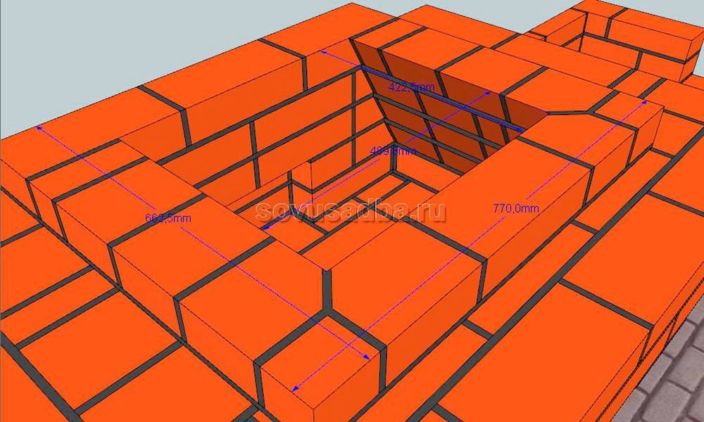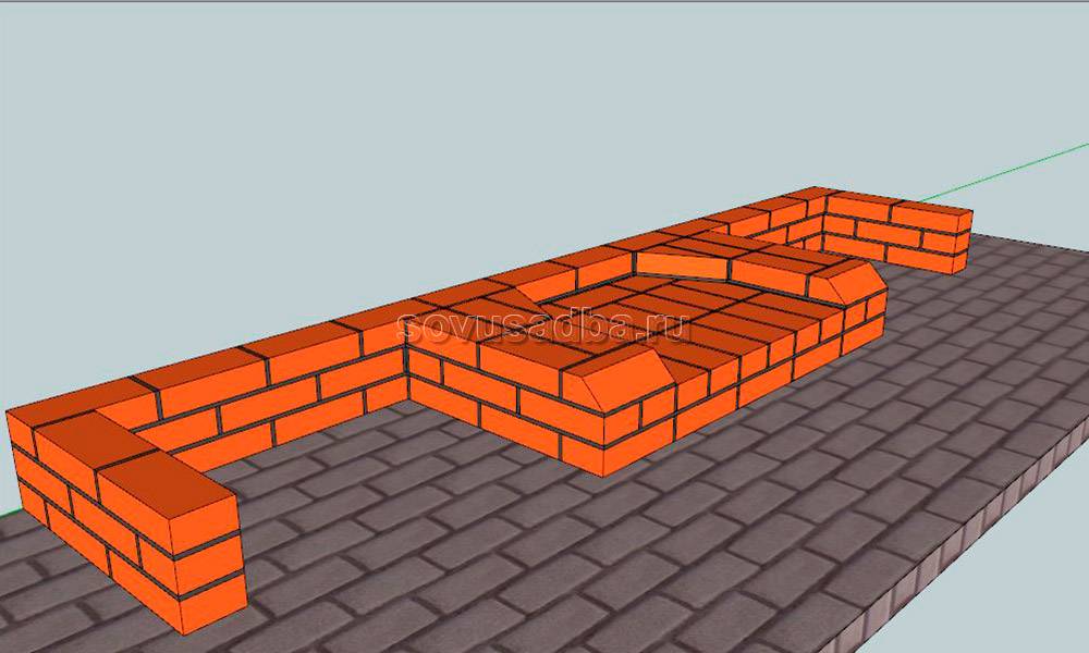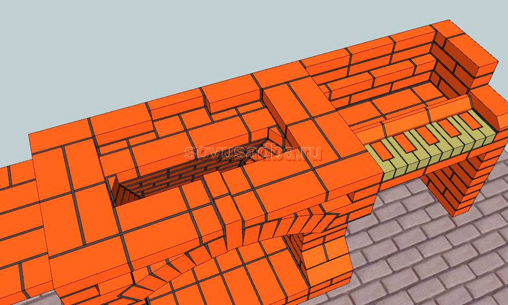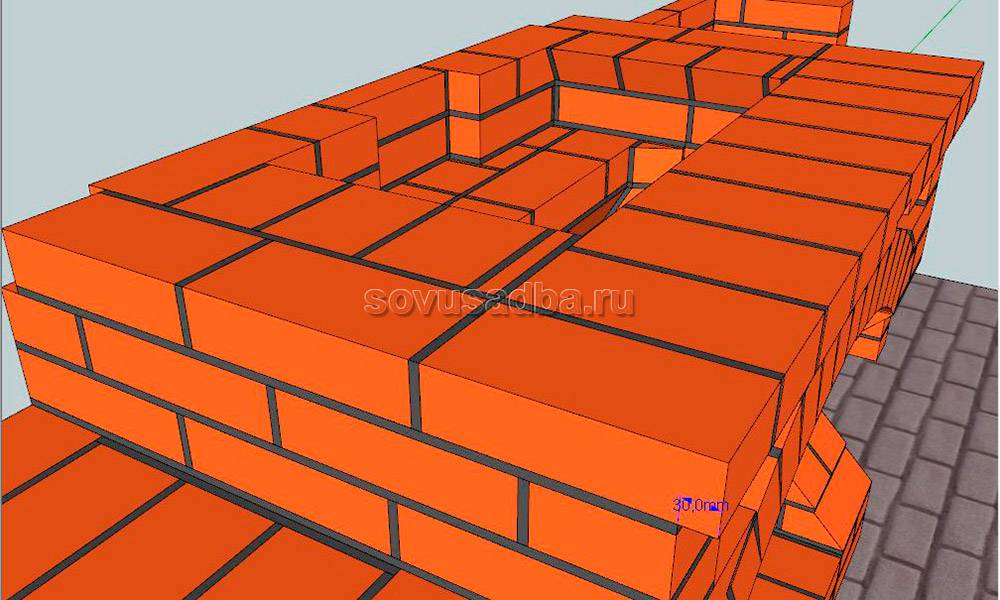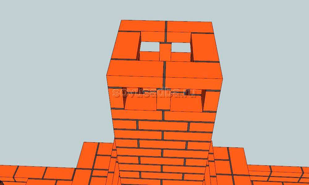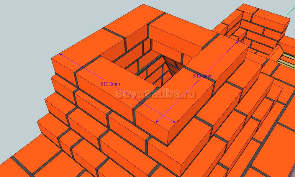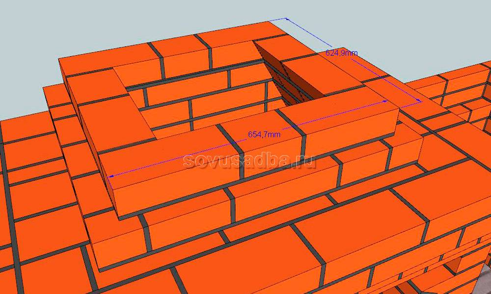 Следующие девять рядов выполните обычной кладкой в полкирпича с самой обычной перевязкой. Единственное требование – хорошо заполняйте кладочные швы, чтобы потом сквозь них не просачивался дым.