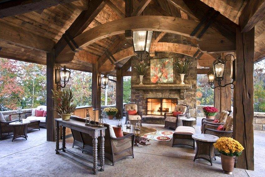 Такие проекты беседок из дерева подкупают потрясающим сочетанием изысканности и деревенской простодушности. Внутри них царит необычайное умиротворение. Потрескивающий в очаге огонь дарит умиротворение. Полноту ощущений обеспечивает пение птиц и садовые ароматы.
