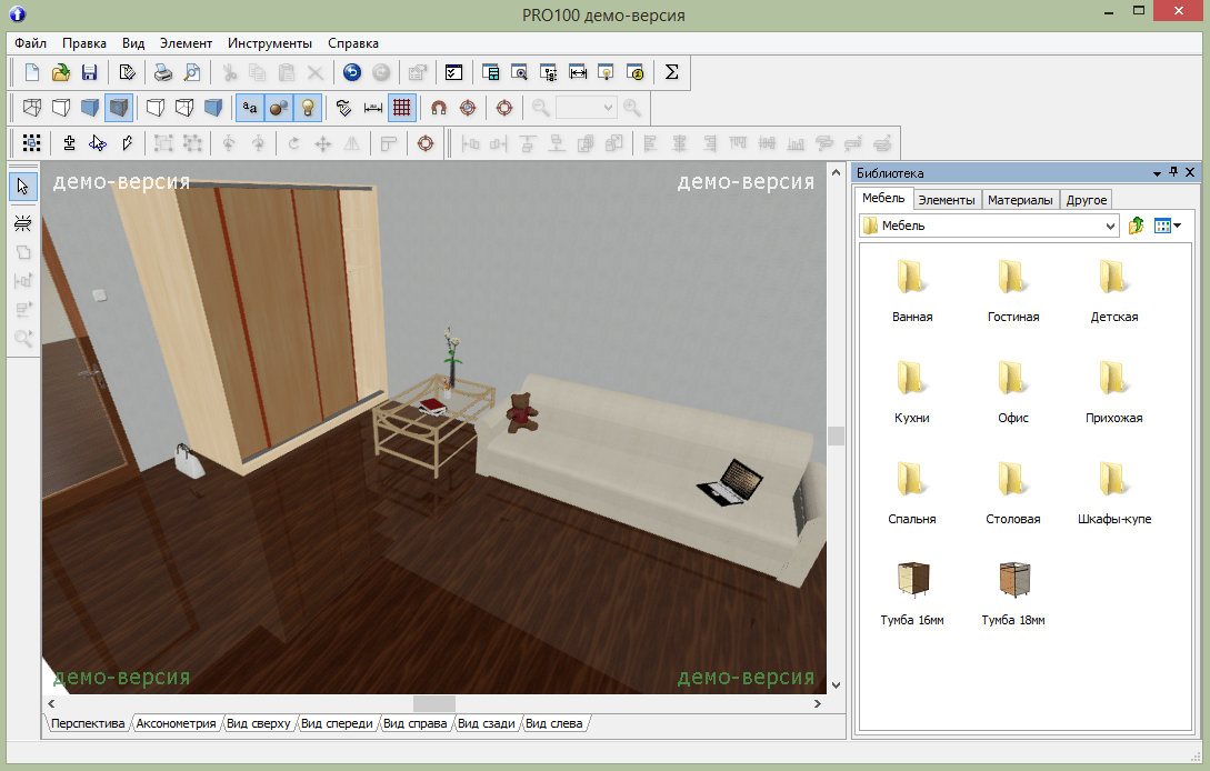 С помощью планировщика интерьера PRO100 вы можете создать на ПК с Виндовс 11, 10, 8 и 7 трехмерный макет комнаты, ванной, детской, офисного помещения. Программа отличается простым управлением, располагает обширными каталогами мебели, техники, предметов декора. Правда, в демо-версии возможности пользователей сильно урезаны. Нельзя сохранить проект на ПК, заблокированы функции редактирования элементов из встроенного каталога, импорт собственных текстур и моделей. Для снятия ограничений необходимо приобрести лицензию.