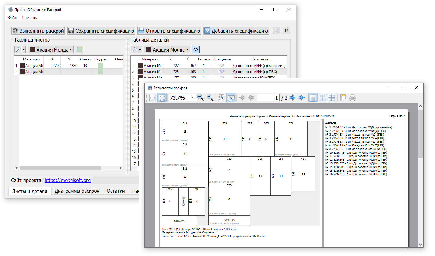 - есть возможность экспорта готовых чертежей в другие программы с детализацией раскроя.
