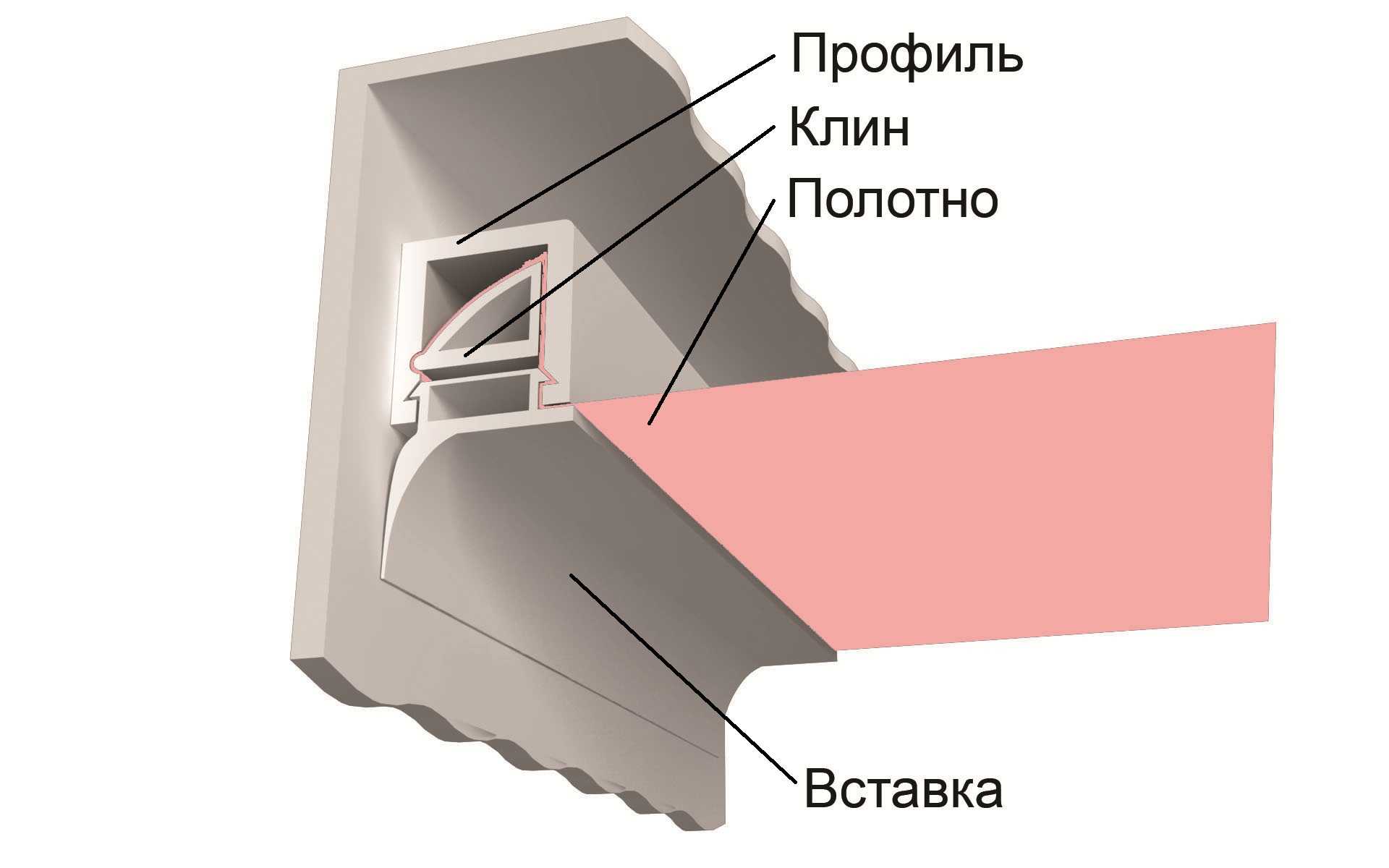 Для тканевых потолков используется проверенный кулачковый метод крепления, где в качестве главного элемента применяется пластиковый багетный профиль, в котором края полотна надежно и прочно защемляются без применения каких-либо дополнительных деталей.