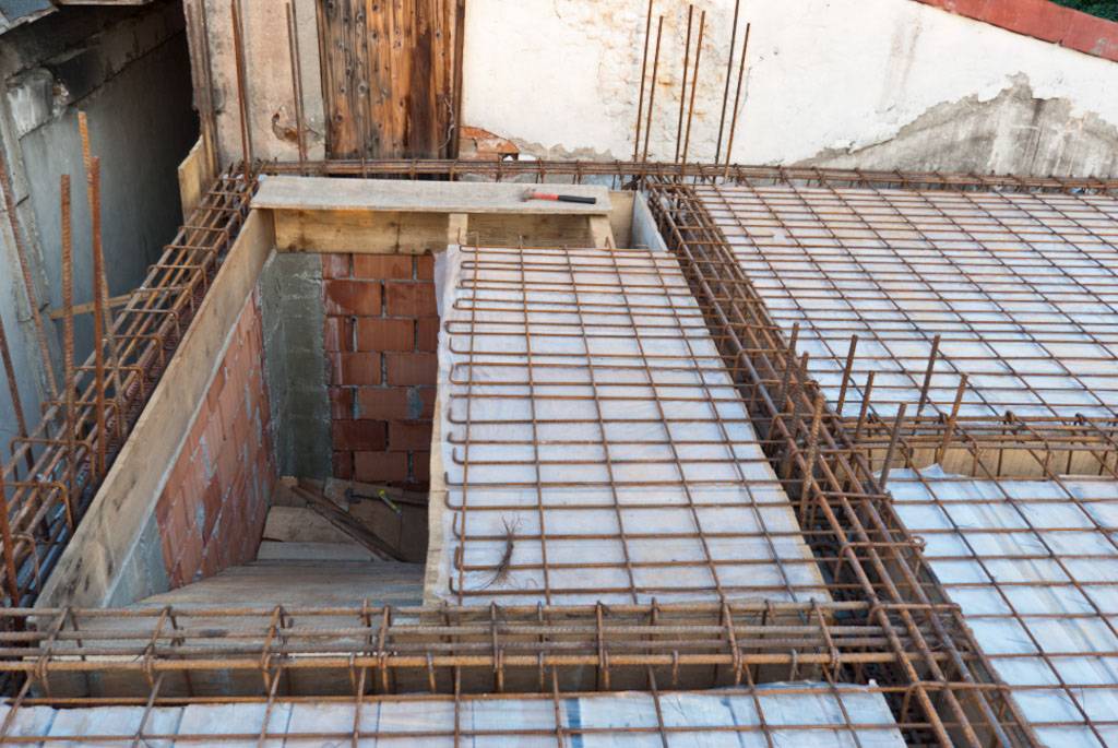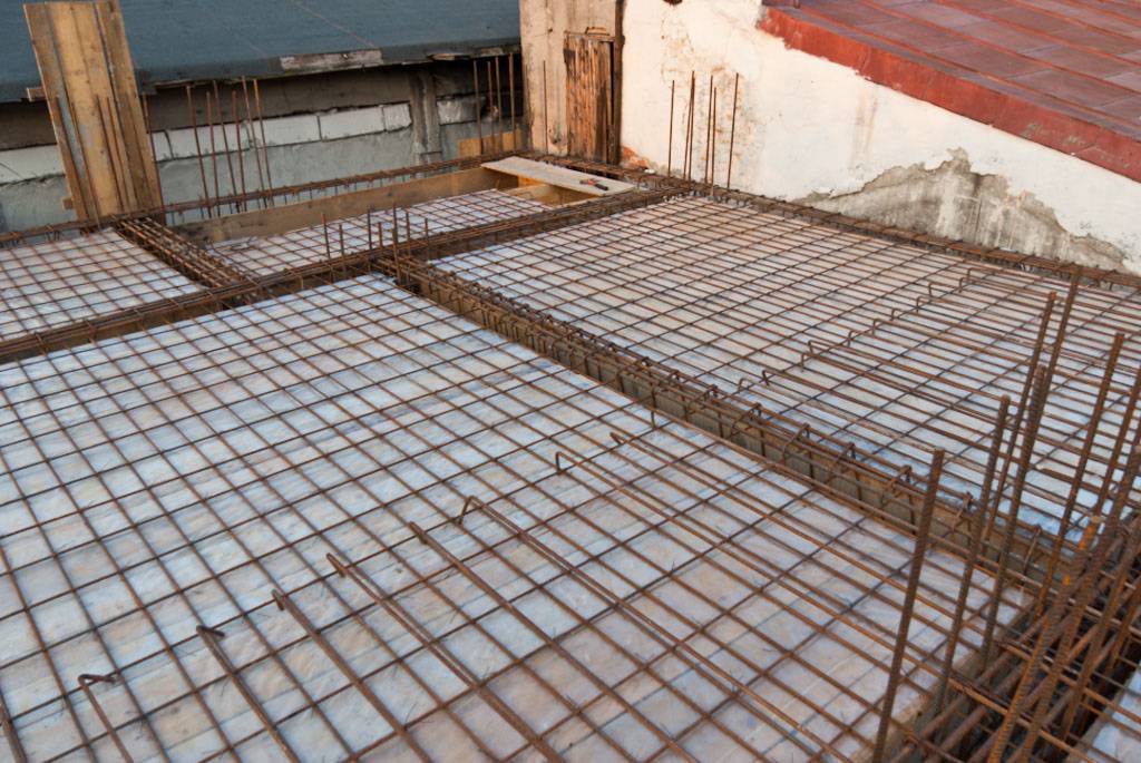 На этом снимке вы можете увидеть крупным планом арматуру для усиления плиты перекрытия. Вы могли заметить, толстые железные штыри, вам интересно для чего они нужны? Арматурные штыри располагаются в верхней части стены и связанны с остальной частью укрепленного монолитного перекрытия. Таким образом, бетонное перекрытие будет поддерживать стены и будет более жестким и прочным.