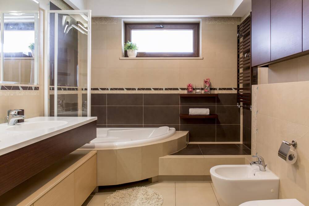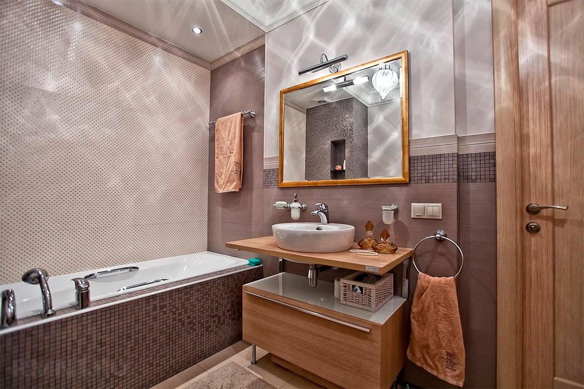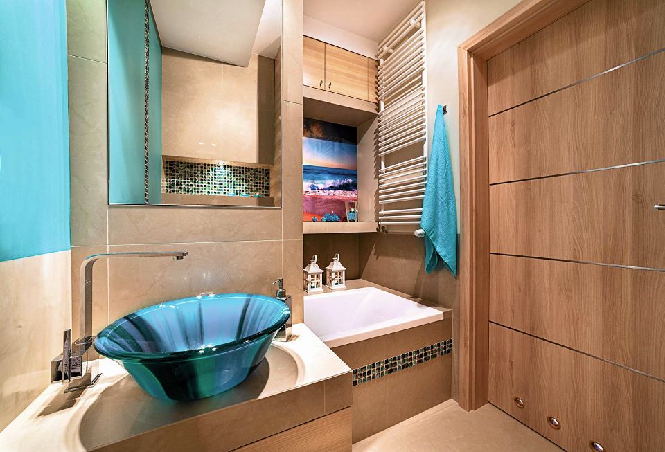 Интерьер ванной в бежево-коричневой палитре замечательно смотрится в комбинации с бирюзовыми, розовыми, пастельными и натуральными тонами. Интересных сочетаний существует предостаточно.