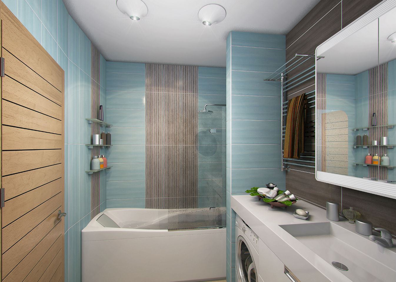 Оформление при помощи акцентных вставок — модный прием. Например, если для пола использовалась коричневая керамика, то настенная плитка этого же цвета должна перекликаться с контрастными вставками. Это могут быть вертикальные или горизонтальные полосы, фрагменты с рисунком и т.п.