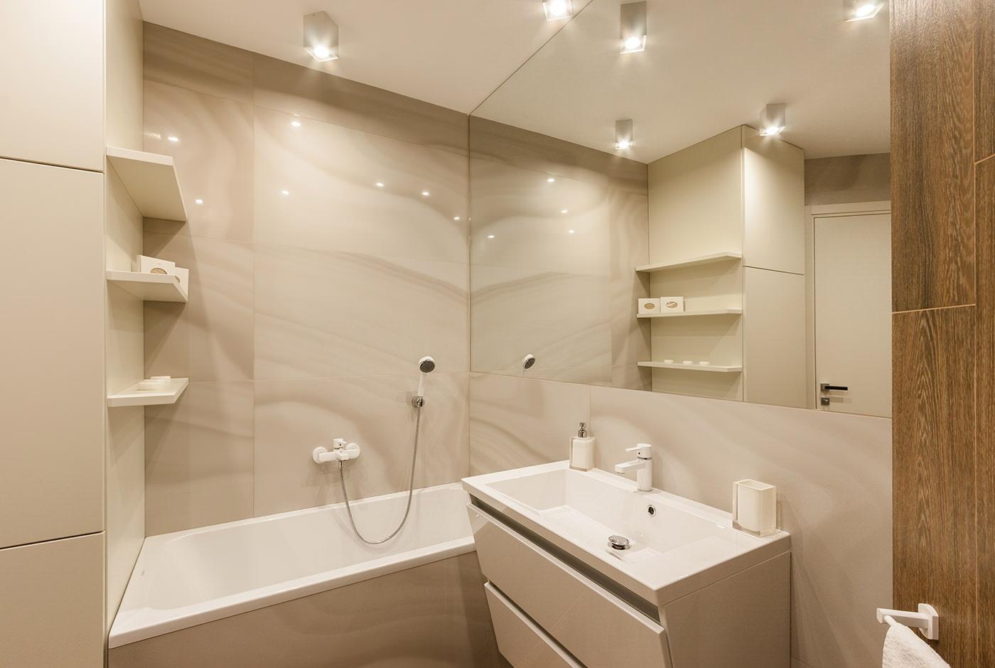 Подсветка натяжного потолка внесет немного разнообразия в интерьер ванной