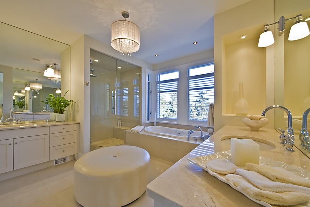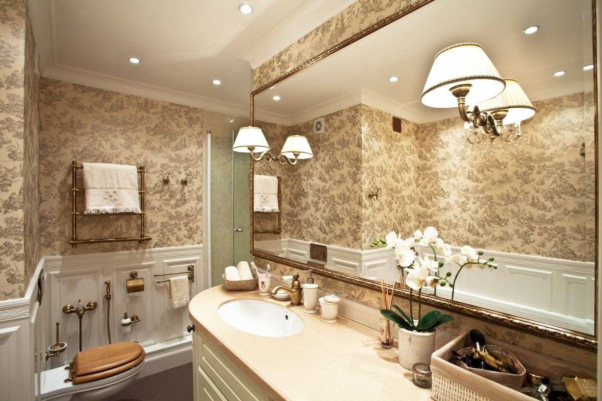 Важно! Так как воздух в ванной обладает повышенной влажностью, следует позаботиться о безопасном использовании осветительных приборов. Необходимо приобретать светильники с низким уровнем напряжения, а также защитой от попадания влаги