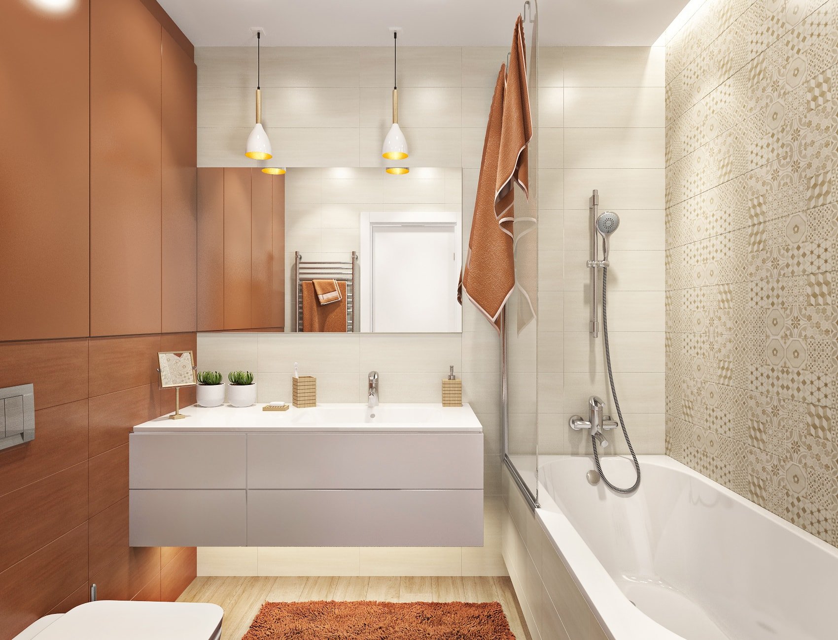 Не стоит злоупотреблять количеством коричневой плитки. Разбавляйте ее оттенками сопутствующих цветов — цвет слоновой кости, кофе с молоком, бежевый и другими.