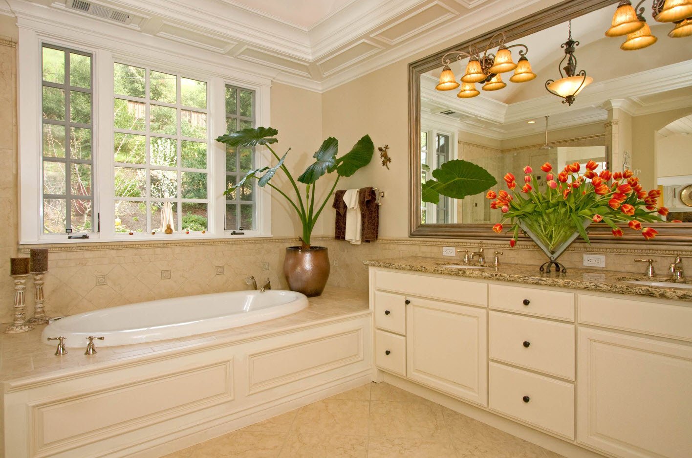 Украсить бежевую ванную помогут необычные светильники, по форме напоминающие фонари, зеркала в красивых рамах, ароматические свечи.