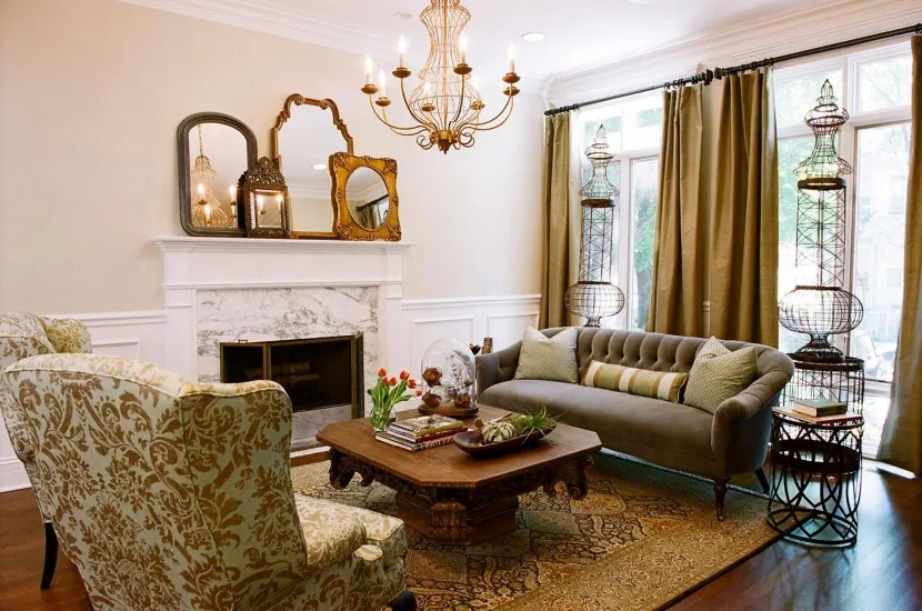 В качестве таких элементов могут использоваться подушки в наволочках с кружевами, презентабельные покрывала, раритетные предметы: к примеру, большой старинный комод или объемное зеркало, обрамленное в раму.
