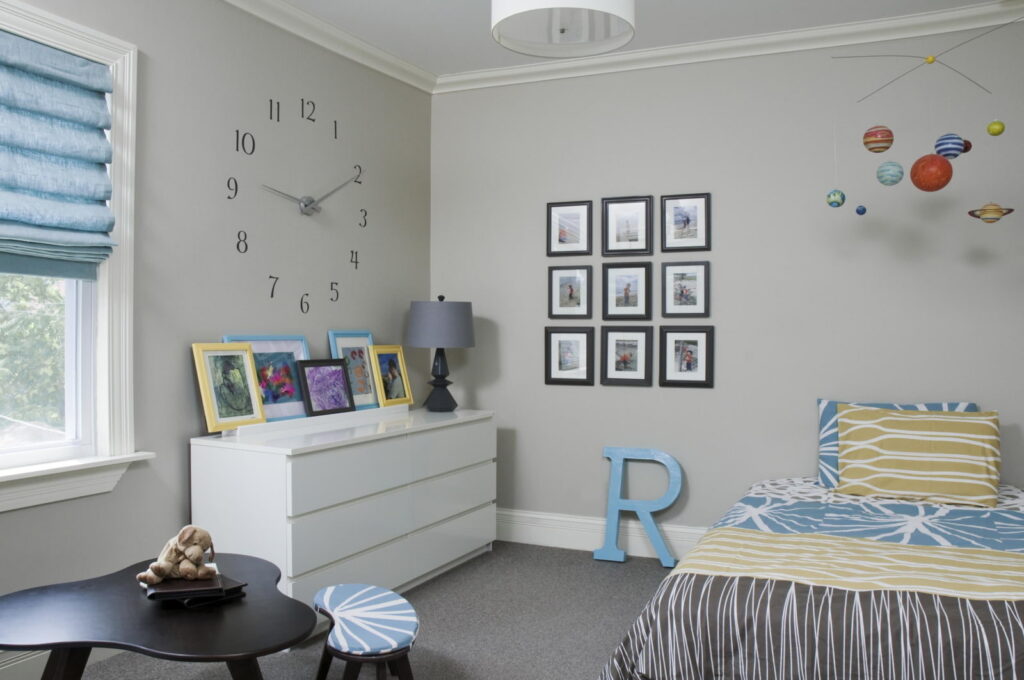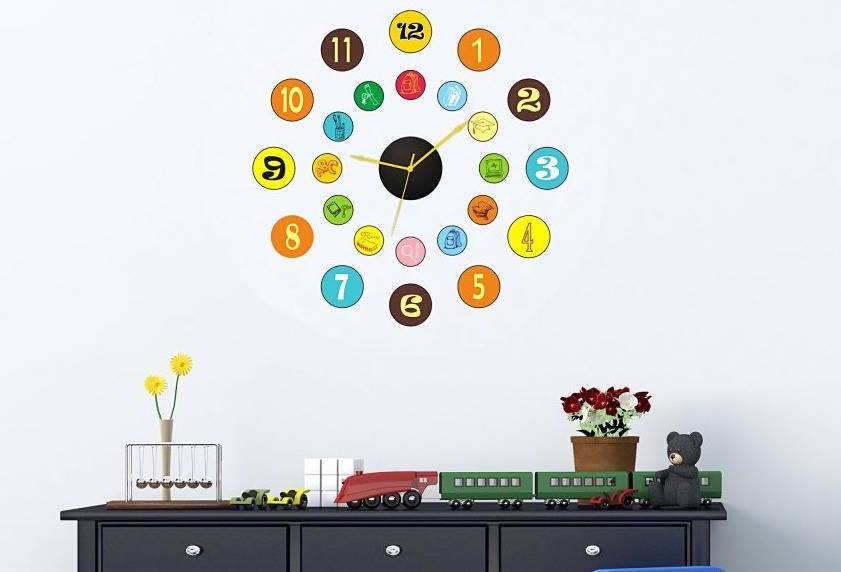 Большие часы внутри детской будут смотреться нелепо и непрактично, ведь ребенок может случайно зацепиться или пораниться.