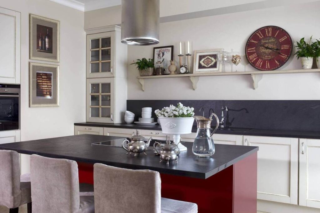 В современной интерпретации винтажного, кантри или классического стиля колпак в декоре встречается нечасто, поэтому часы на такой кухне можно закрепить непосредственно над плитой, на вытяжку или под ней. Если это невозможно, расположите их где-нибудь поблизости с плитой. Место для часов всегда найдется.