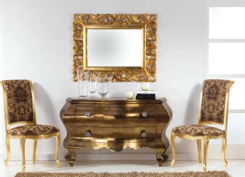 Для подобного стиля используют зеркала в широких рамах, декор которых выполнен бронзовыми деталями.
