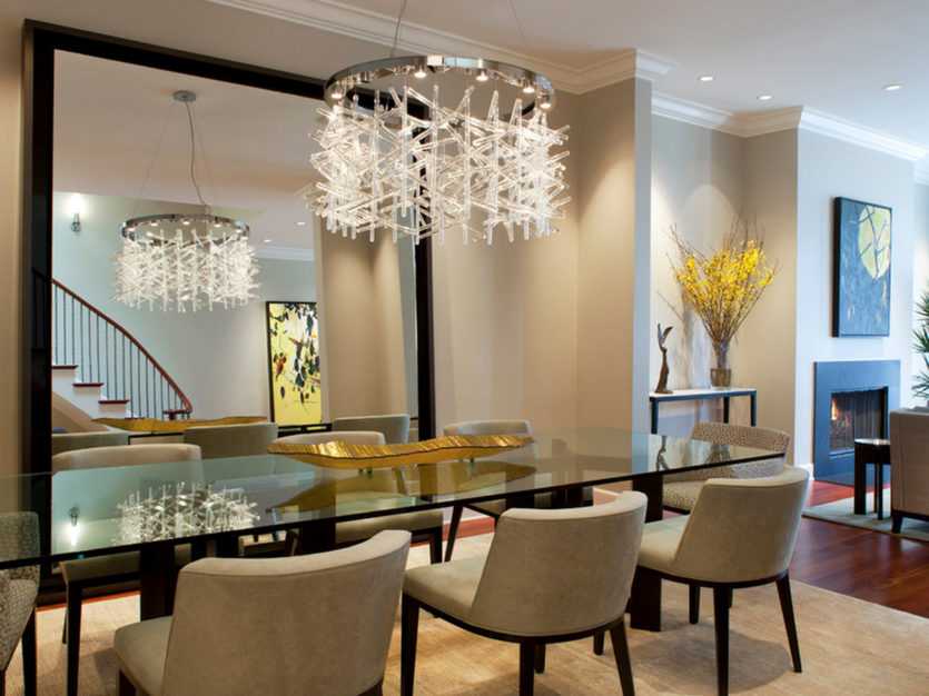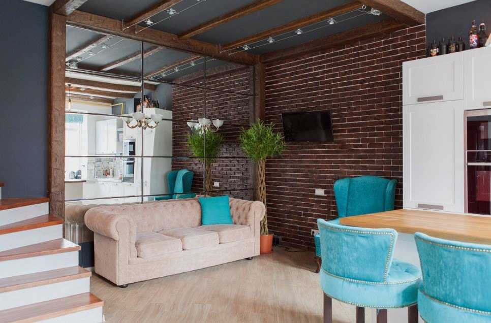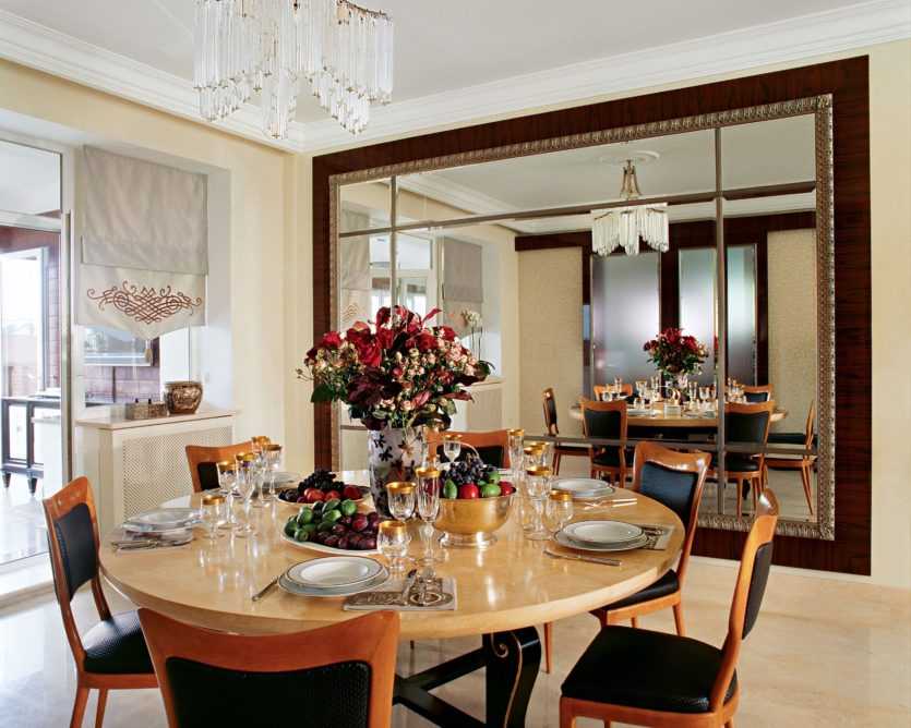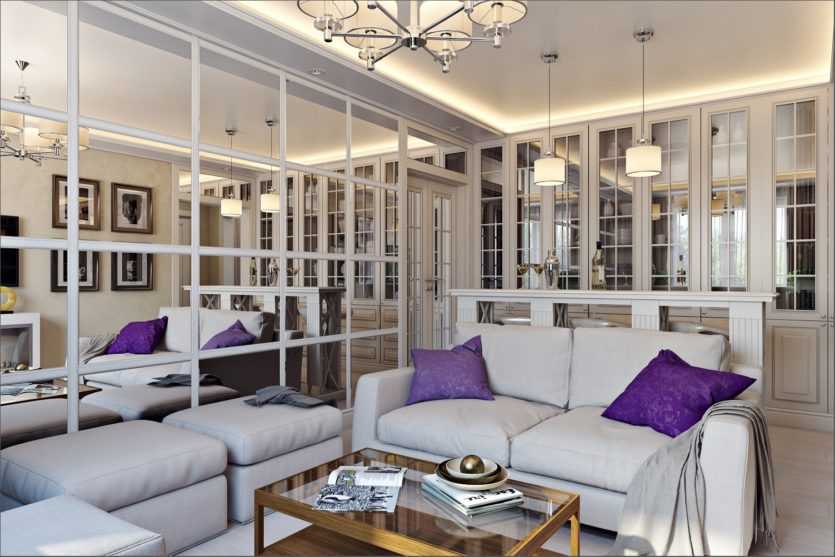 Современные дизайнеры предлагают проект объединенной гостиной и кухни. Зеркальце в комнате можно повесить на колоннах, которые исполняют роль разделителя двух помещений. Весьма стильно выглядит мозаика из осколков зеркал. Вы можете разместить её на стене своей комнаты. В таком случае ваш интерьер будет очень интересным и гармоничным.