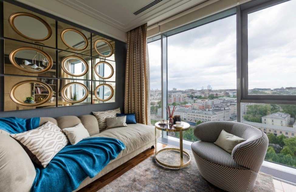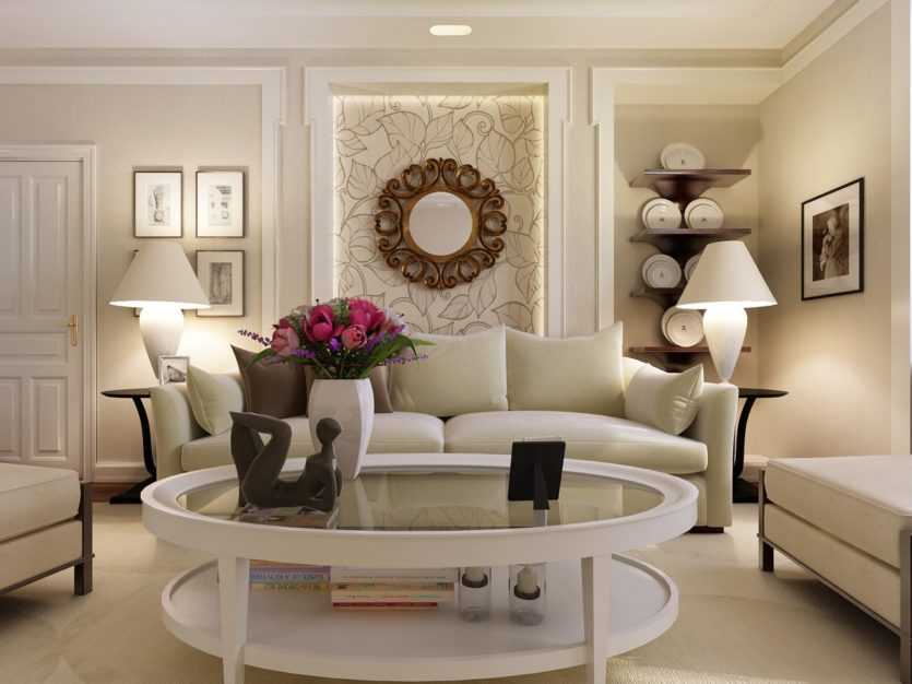Зеркала круглой формы также можно повесить в гостиной. Однако помните, что это не может быть одно зеркало. Создавайте комбинацию из нескольких неодинаковых по размеру и размещению зеркал. И не отчаивайтесь, если у вас только одно зеркало. Пускай оно играет главную роль и станет центральным отражателем солнечного и искусственного света в комнате. Зеркало должно зрительно увеличить размеры маленькой гостиной.