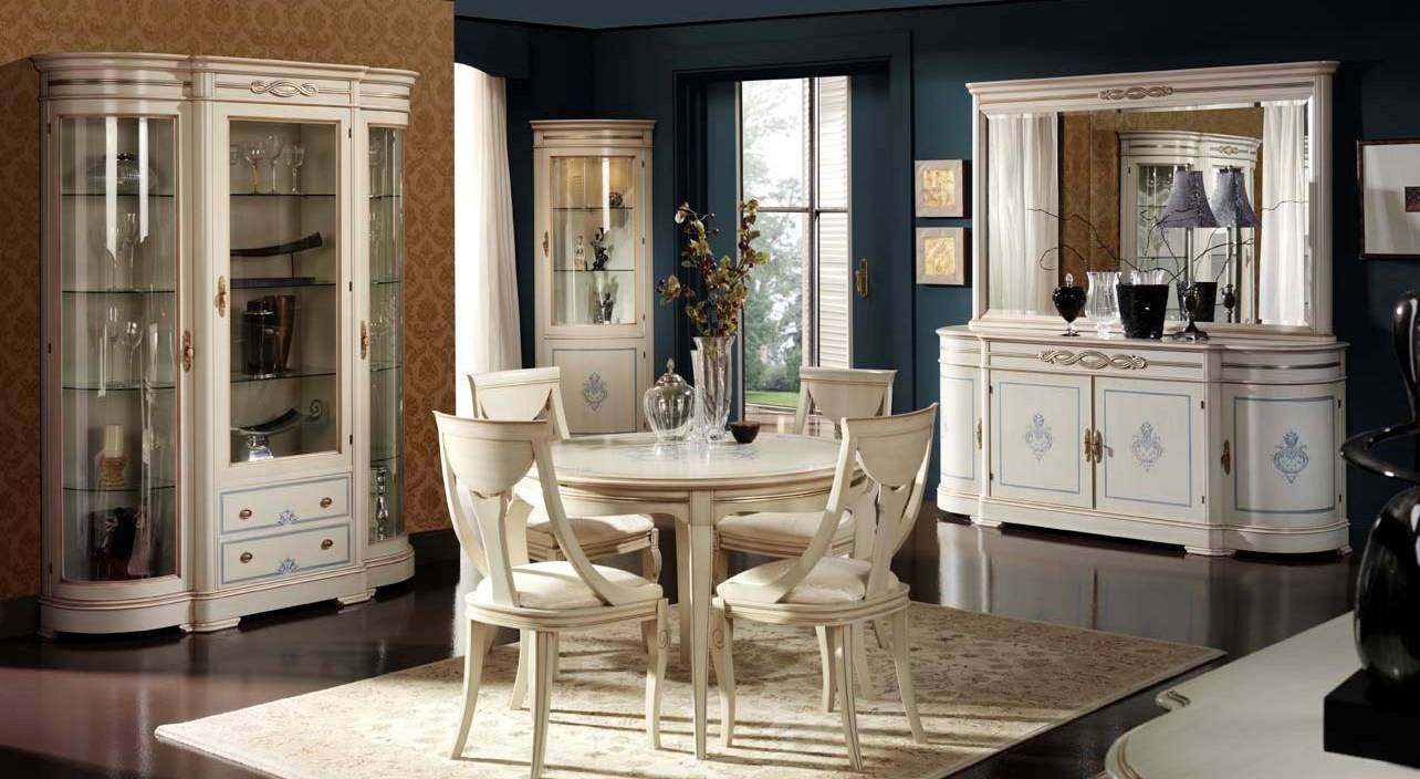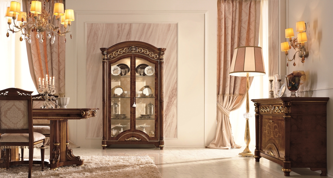 Классический. Для классического интерьера – это незаменимый предмет мебели, особенно для гостиной, в которой есть столовая или обеденная зона. Буфет в классическом стиле имеет изящную резьбу или роспись, что придает ему аристократический вид. Выкрашены такие шкафы могут быть в белый цвет или цвет натурального дерева. За стеклянными дверцами буфета можно выставить дорогие сервизы или коллекцию фарфоровых статуэток.