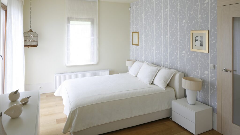 В спальную комнату следует подбирать обои, которые оттеняют мебель и подчеркивают стильность помещения.