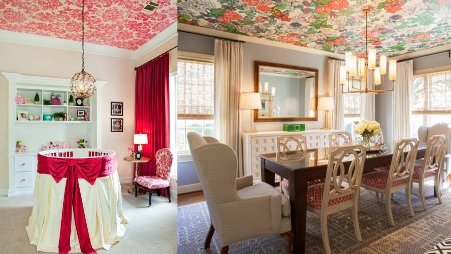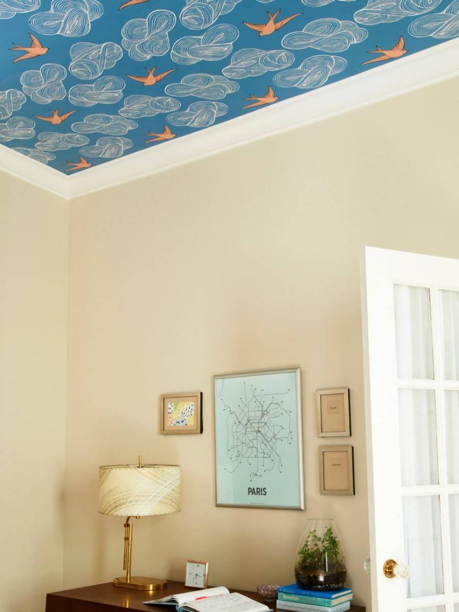 Для потолка производители предлагают бумажные, флизелиновые, виниловые на бумажной или флизелиновой основе и текстильные обои.
