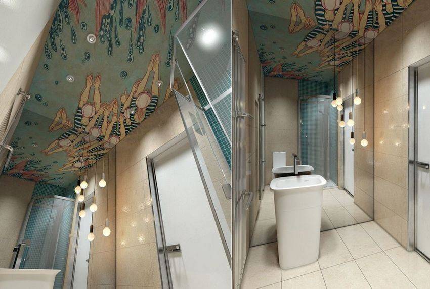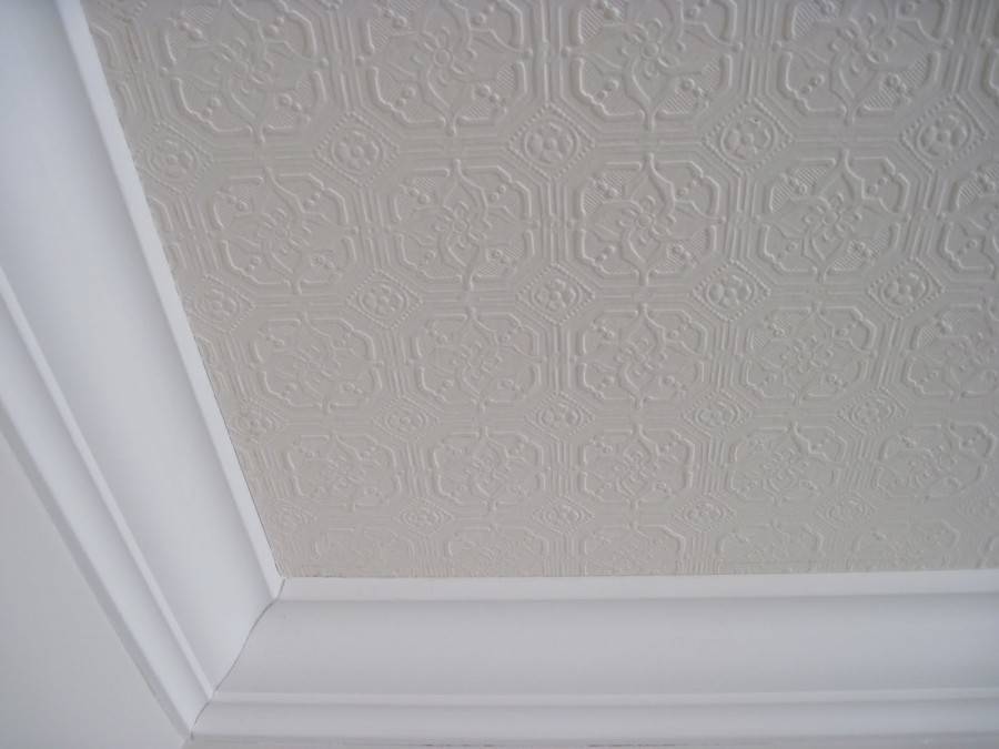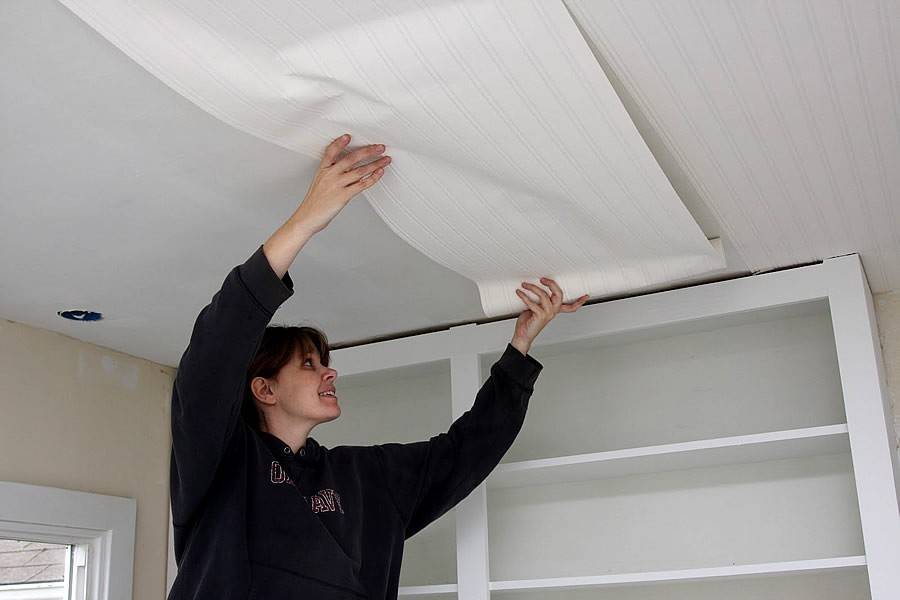 Отделка потолков обоями из винила, отличный вариант для тех, кто задумался над вопросом как клеить обои на потолок в одиночку, поскольку клеем промазывается только потолок.