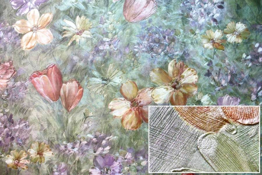 Флизелиновые. Флизелиновыми обоями в быту называют виниловые и текстильные обои с флизелиновым основанием, а также чисто флизелиновые. Здесь речь идет о непосредственно флизелиновых обоях. Они многослойные, с рельефным рисунком. Покупаются в основном под окрашивание. Технология поклейки необычная — клей наносится на оклеиваемую поверхность. Идеально подходят для потолка: