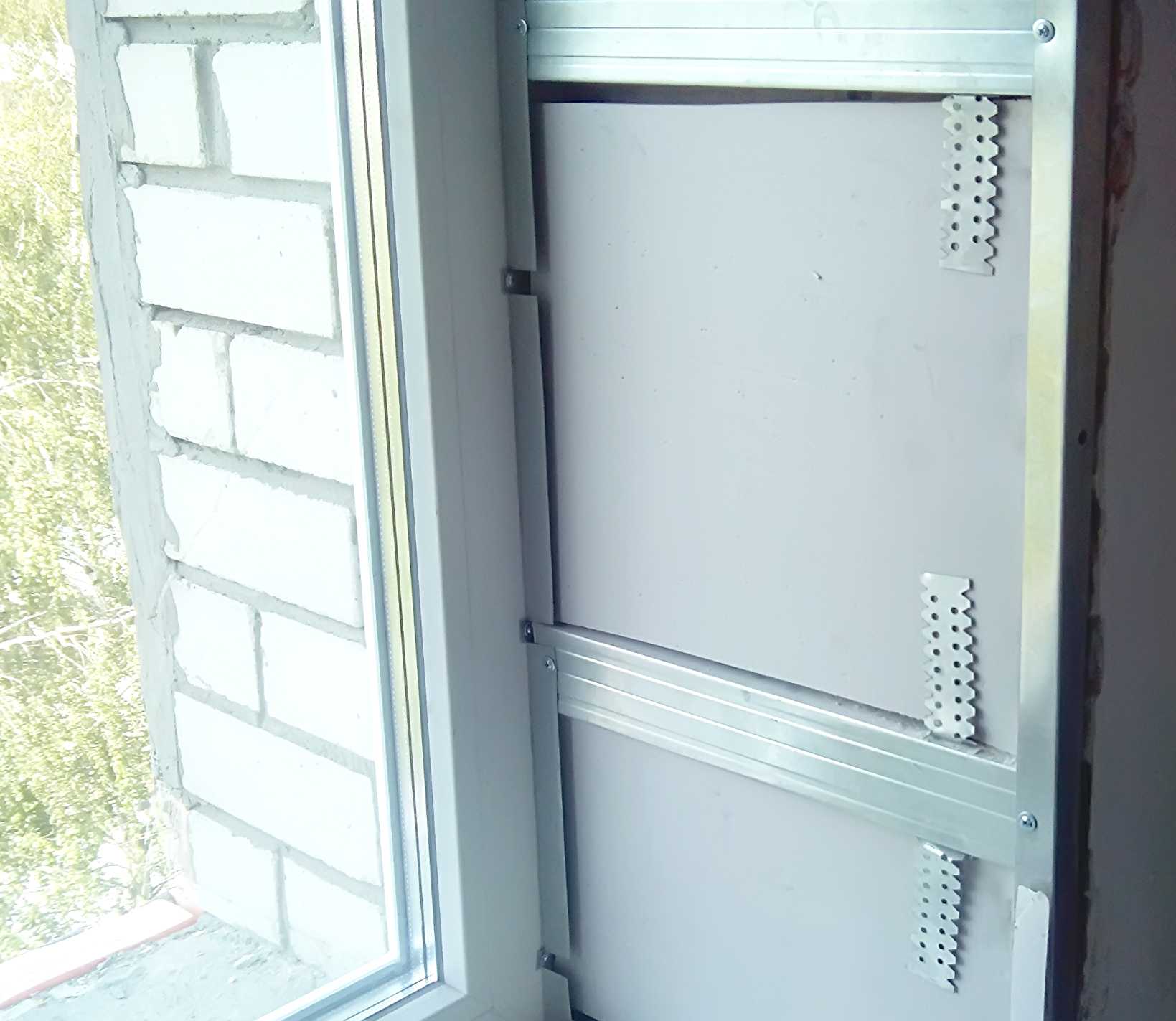 Далее нужно закрепить планку на профиль окна или раму, которая надежно зафиксирует гипсокартон со стороны стеклопакета. Поверх планки устанавливают гипсокартонные панели, тщательно обрабатывая образовавшиеся пустоты герметиком. Тогда конструкция будет лишена мостиков холода.