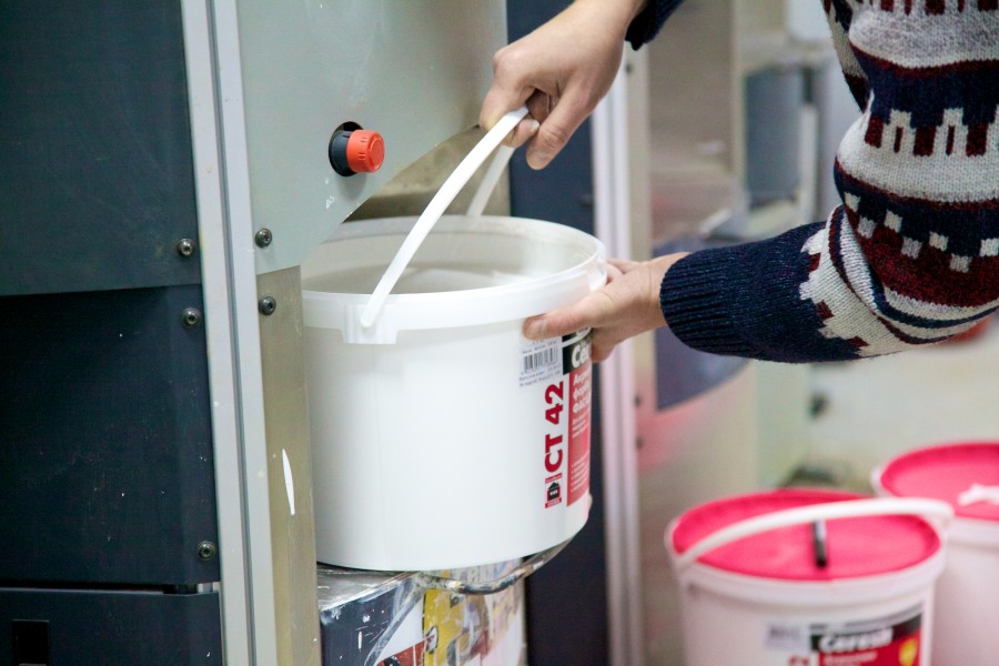 - Краска переливается в тару. Процесс выполняется аккуратно, состав немного перемешивают.