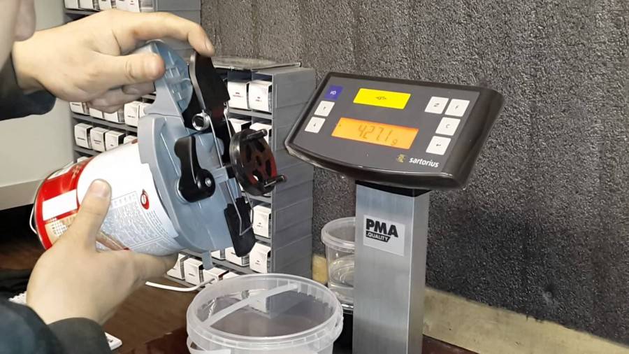 На банках с краской указана оптимальная ее вязкость. Если замеренный показатель слишком высокий, то в емкость добавляют загуститель или оставляют на время до высыхания материала до нужной вязкости. Если, наоборот, показатель слишком низкий, то в краску нужно добавить воду.