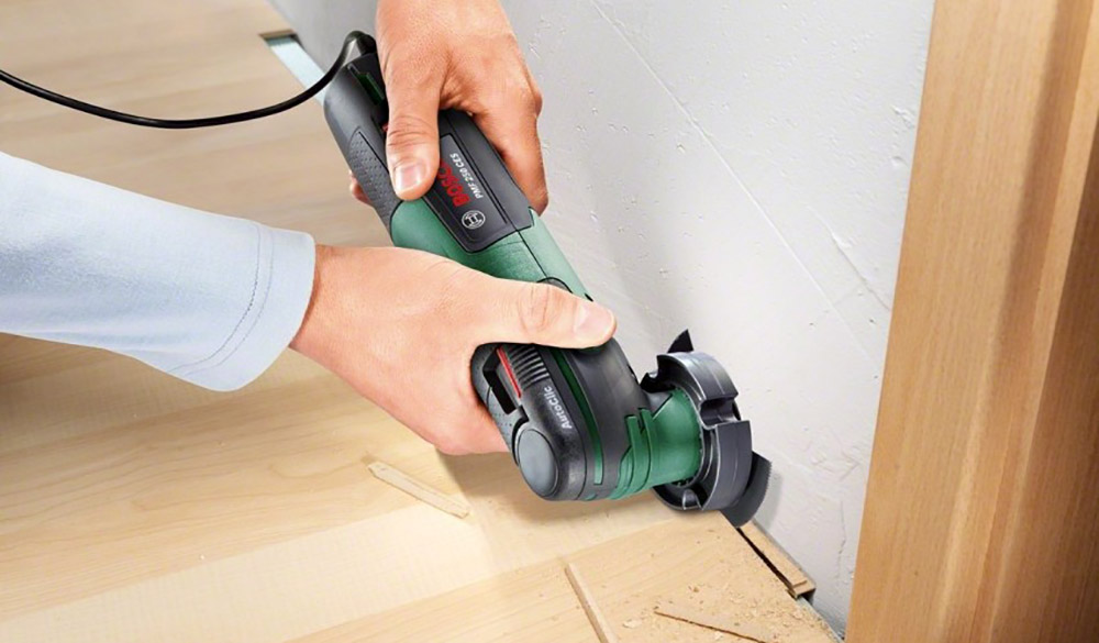 После укладки ламината часто требуется выравнивание краёв настила по направлению длины ламелей. Если их нужно обрезать у самых стен, где обычные ручные или электрические инструменты не подходят, применяют реноватор, который способен делать обрезку даже на уровне нескольких сантиметров от стены.