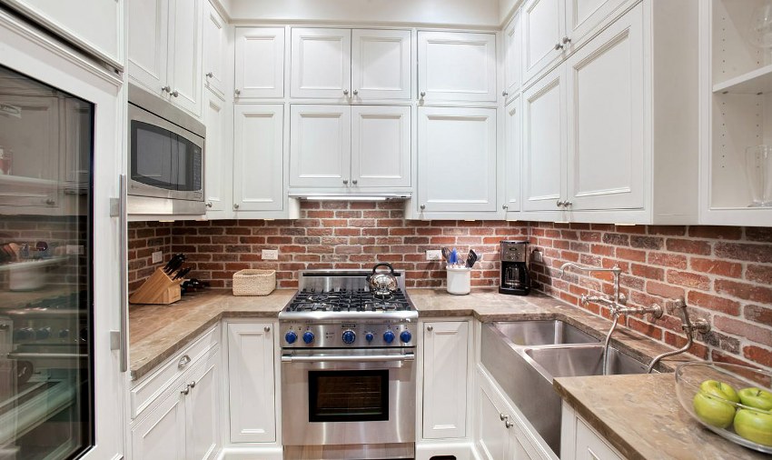 Кирпичная кладка в сочетании с белой кухонной мебелью выглядит эффектно
