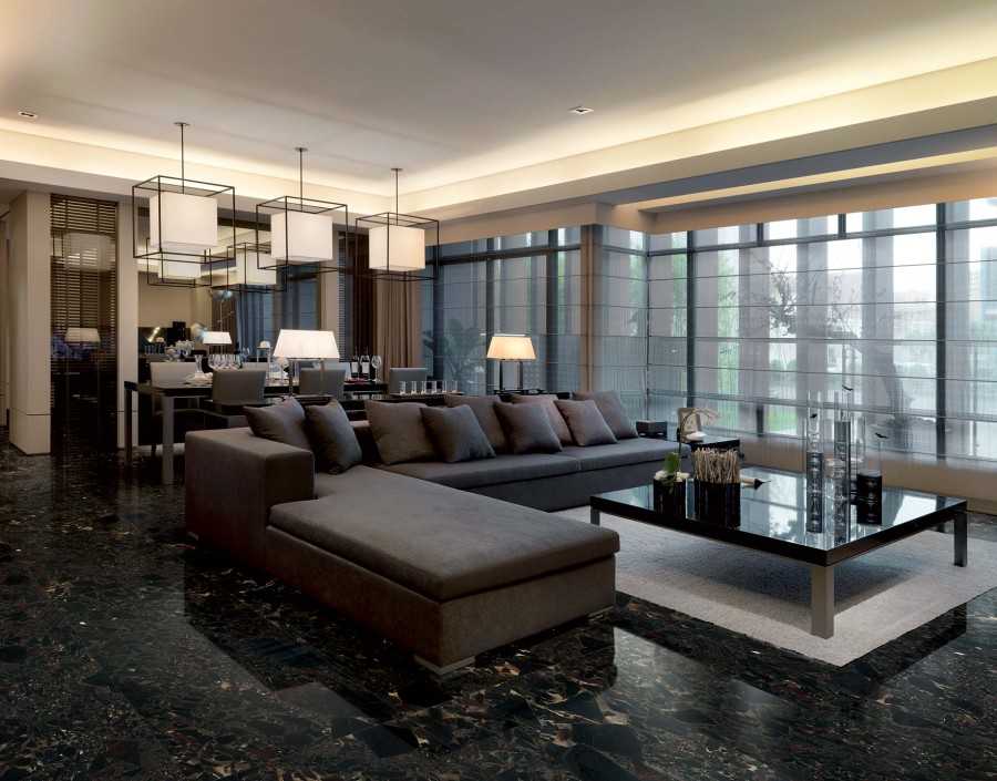 Темный пол в гостиной – это не только черные варианты. Сюда также относятся напольные покрытия, отличающиеся глубокими оттенками: