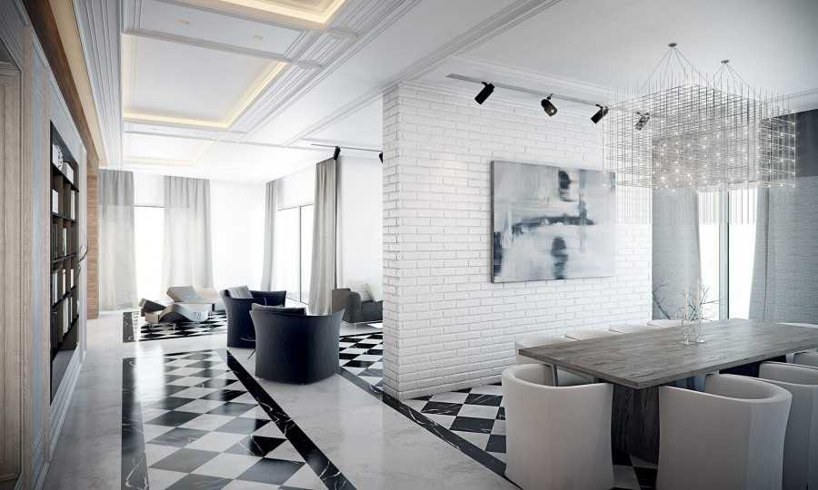 С белым. Такое сочетание смотрится дерзко и индивидуально. Оно впишется в направления минимализм, хай-тек и лофт. Для реализации черно-белых полов подойдут следующие отделочные материалы: керамическая плитка керамогранит, ламинат или паркетная доска.