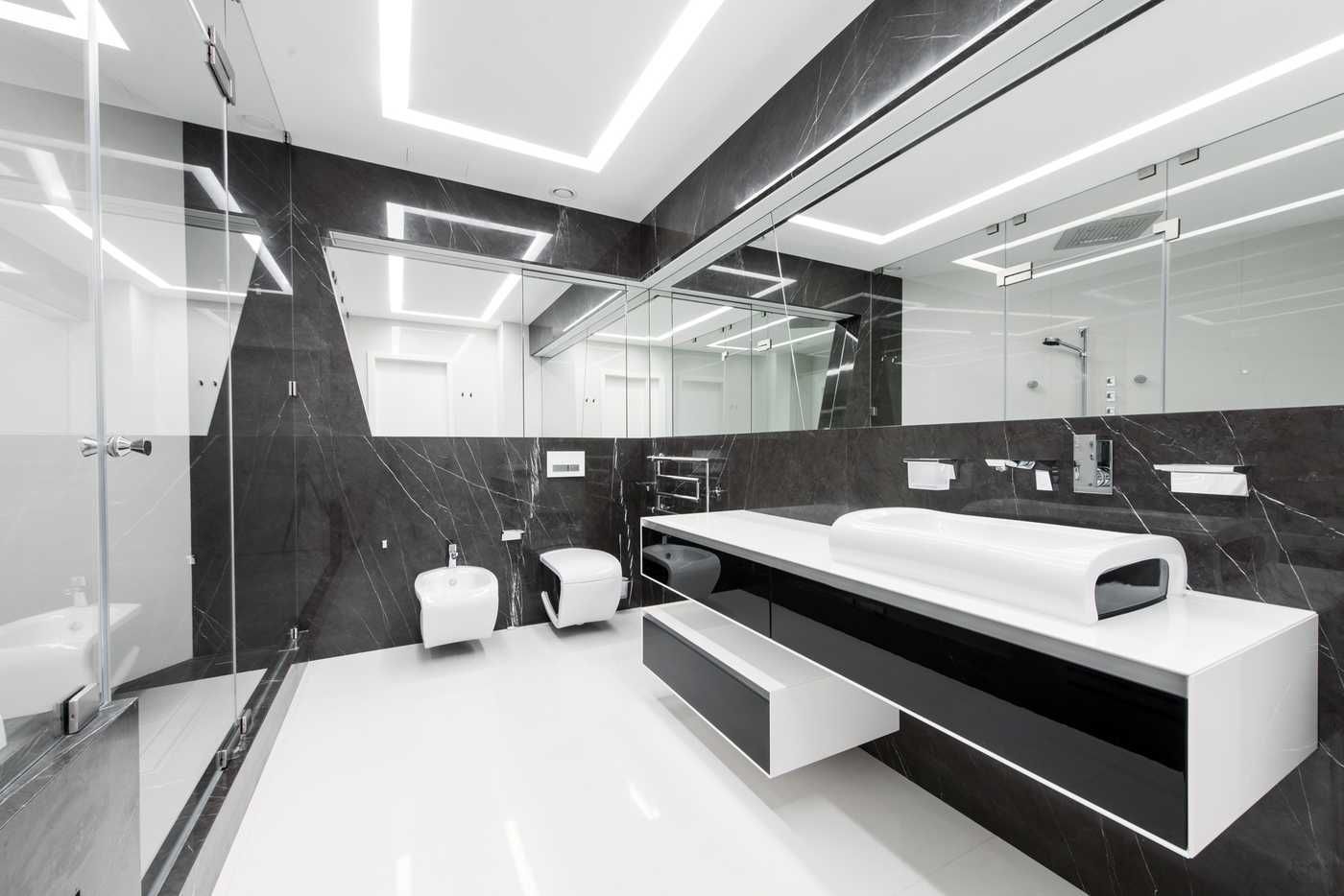 Ванная комната в чёрно-белых тонах, стиль хай-тек